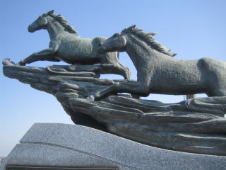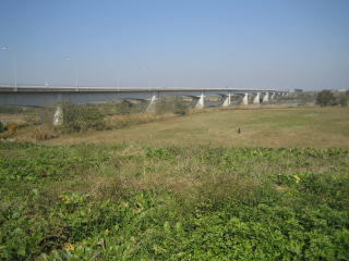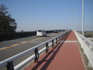 2013/11/17 快晴。温暖。9:38「上武大橋」北詰下流堤防下に駐車。橋を渡り利根川右岸を下流へく。10:13河川敷グラウンド四面で少年の野球の試合あり。10:53「新上武大橋」直下を通過。11:06土手を右折して「小山川橋」をわたり小山川右岸を上流へ。11:23「しんめいはし」。11:30小山川土手を降りる。11:36「石塚稲荷神社」。11:52信号のある「石塚交差点」から「新上武大橋」への上りに入る。橋の上から四方を見渡すが、暖気のせいか靄っていて「太田金山」がうっすらと見えるのみ。長い橋の歩道上で出会ったのは自転車の一人のみ。12:23橋の北詰、歩行者用上り下り口。馬のモニュメントあり。左岸土手下で昼食。12:58ヘリポートの着地点。左側にゴルフ場が続く。1:20ゴルフ場クラブハウス前。1:44駐車地点。