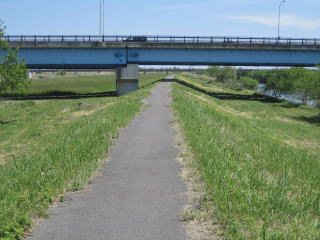 2013/05/12 晴れ。11:58「渡良瀬川大橋」左岸100M位の堤防上へ駐車し下流へ歩く。正午の鐘の音が下流の方から、かなりの音量で聞こえてくる。12:14「高橋大橋」。橋を渡り、右岸の矢場川と渡良瀬川との間の低い堤防上を歩く。12:32ゴルフ練習場。おにぎりの昼食を食べる。1:01「渡良瀬大橋」橋脚下。1:05堤防の終点。1:08「渡良瀬橋梁」下。1:14渡良瀬川、矢場川合流点手前で引き返す。1:50「高橋橋」1:56「雷電神社」。屋根瓦の重厚さがまさに聳え立つ感があるが、近寄ってみると痛みが激しく朽ち落ちる一歩手前。高橋橋へ戻り、右岸を上流へ。2:27「渡良瀬川大橋」南詰。強風の橋を渡る。2:35出発地点。