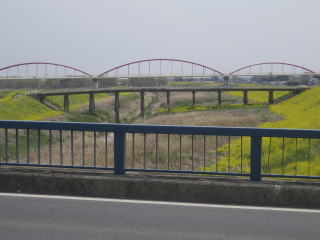 2015/4/12 晴。9:08「荒川大橋」左岸土手下「熊谷南小」傍道路に駐車。左岸を下流へ歩く。 9:14「荒川大橋」。この辺りの桜並木、花の終りの葉桜状態のなかブルーシートが何枚か見える。10:11「くげはし」。橋を渡る10:19「久下橋」南詰。右岸を下流へ。この辺り土手の低い処有。11:12「熊谷市立健康スポーツセンター」前11:21「玉作水門」。11:45「大芦橋」。橋を渡り左岸へ。12:02「大芦橋」北詰。上流から見える14連のアーチ橋はすぐ下流の水道橋で、この橋も意外に長い。12:08「荒川水道橋」下で昼食。1:10水防倉庫横のベンチで休憩。この辺り堤防上は通行できず。1:52「糠田橋」北詰。76号線を北上し「ドンキホーテ」まで進み、右折して「鴻巣駅」方面へ向うが道を尋ねて「北鴻巣駅」の方が近いことがわかり数百M位戻り進む。3:02「北鴻巣駅」。